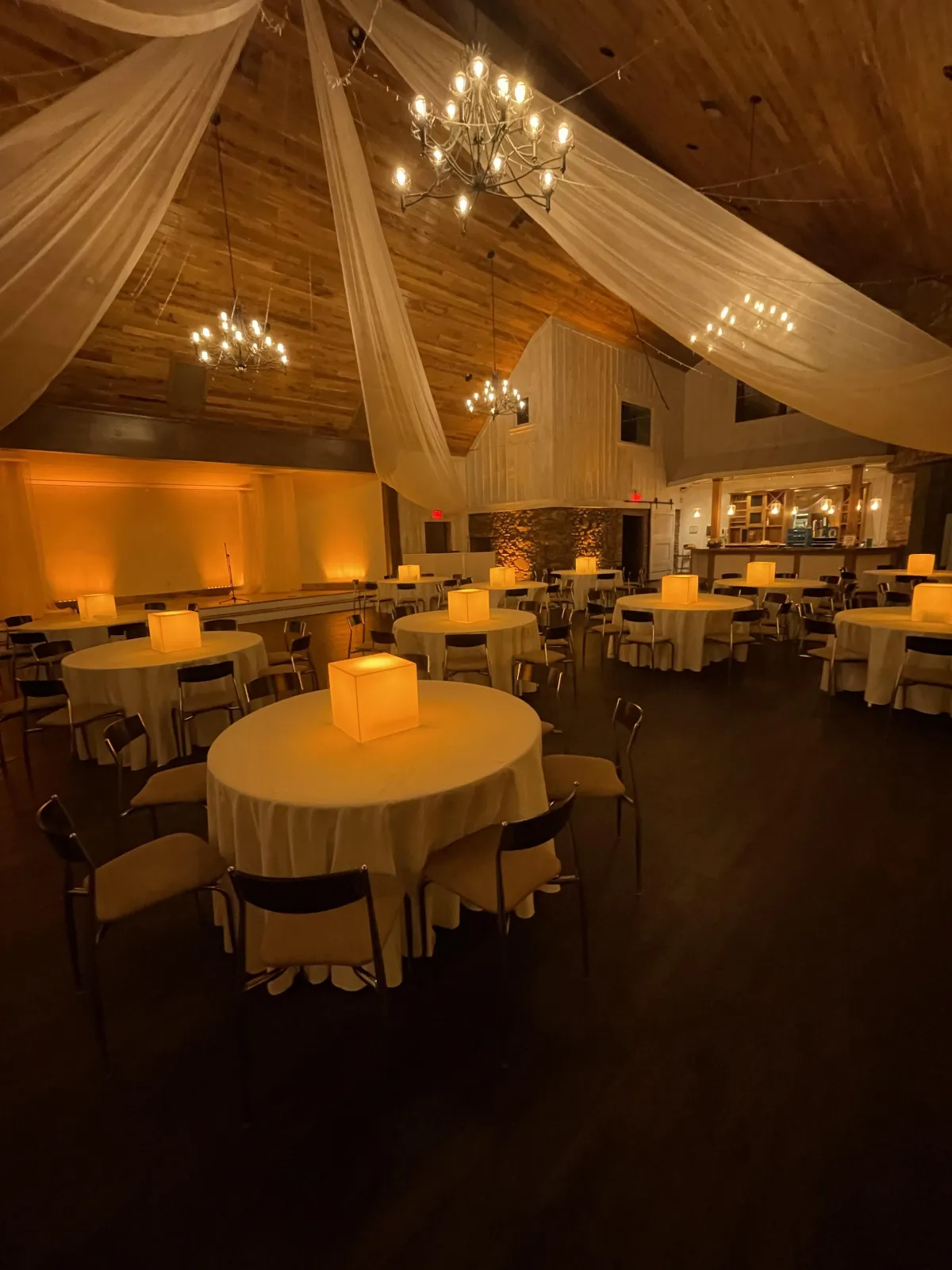 Elegant lighting, twinkle accents, draping, and flexible layouts to match your vision.